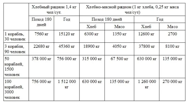 Всего на год одному кораблю на 30 человек — 12,6 тонн зерна и 2,7 тонн мяса.