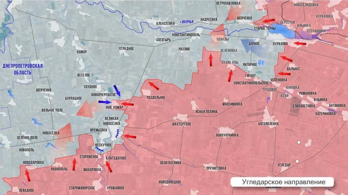 На Угледарском направлении Великая Новоселка, судя по всему, оказалась в реальном полуокружении. ВС РФ добрались до дороги от Времевки на Гуляйполе и закрепились за ней, лишив Великую Новоселку последней асфальтированной дороги. Остается еще несколько грунтовых дорог северо-западнее, нашим бойцам осталось пройти около 1 км на север, чтобы блокировать и их. ВСУ активизировали контратаки в Новом Комаре, стоит ожидать их и на дороге на Гуляйполе. В районе Разлива ВС РФ развивают наступление в сторону Константинополя. В Курахово наши силы постепенно окружают гарнизон ВСУ, закрепившейся в промзоне на западе города. Все ближе решающий момент, когда на одном из участков армия России перережет дорогу на Запорожье и закроет котел, противник отчаянно сопротивляется.