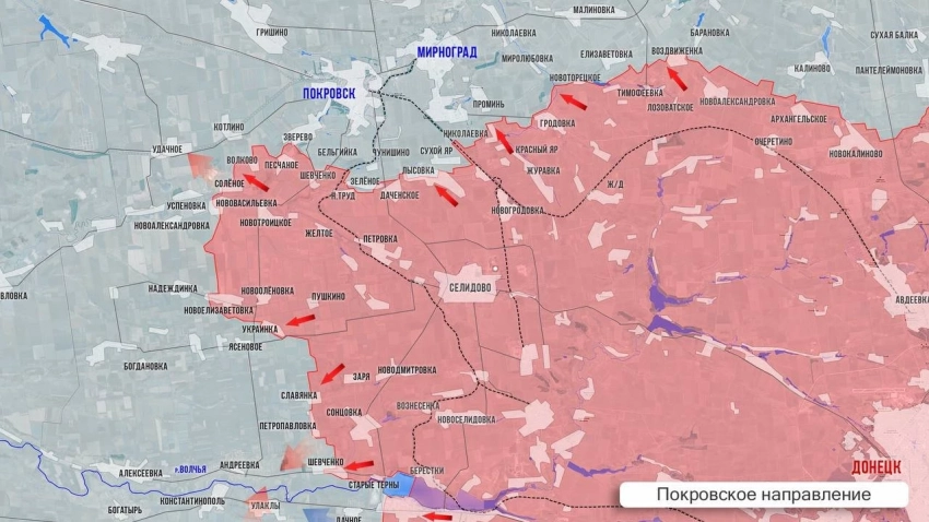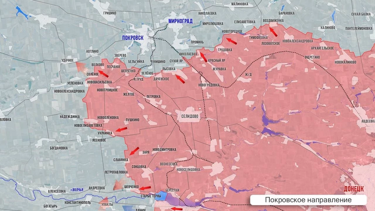МО сообщило об освобождении Даченского - село в 5 км к югу от окраин Покровска. Село небольшое, но его освобождение позволит нашим силам расширить плацдарм для наступления на город. Впрочем, скорее всего он начнется, после того, как город не обойдут с запада. Здесь наши подразделения атакуют в направлении Котлино, Удачного, Новосергеевки, Зверево, а также трассы М30. Южнее по фронту идет ожесточенное сражение в районе Солёного за карьер в балке Кривуля.