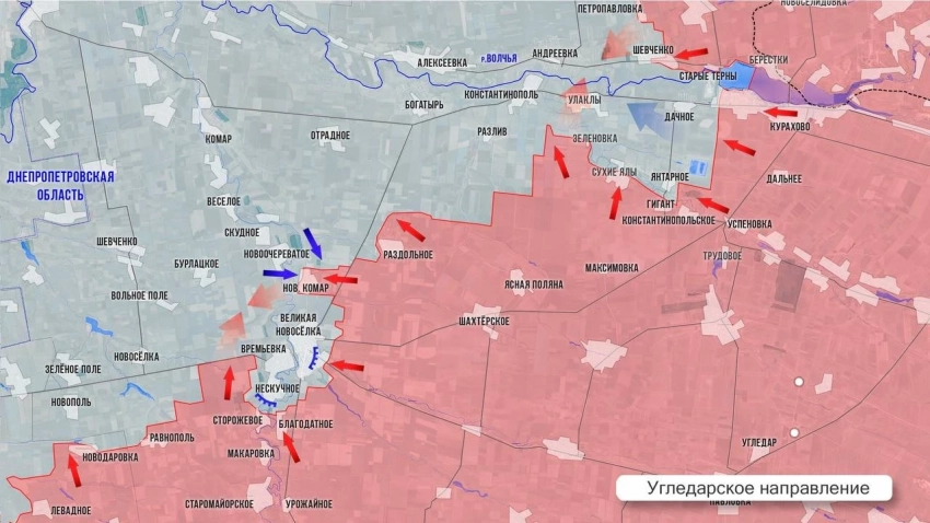 На севере ВС РФ закрепились в лесополосах севернее Нового Комара и двигаются к Отрадному, на юго-западе вклиниваются в оборону противника западнее Времевки. ВСУ пытаются препятствовать окружению, но сил на прорыв блокады не хватает.