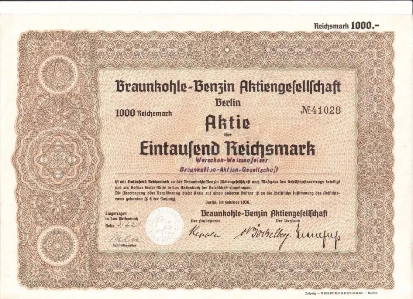 Акция Braunkohle-Benzin AG стоимостью 1000 рейхсмарок