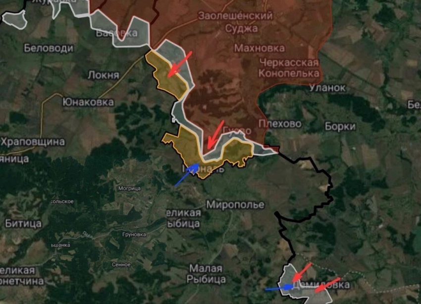 Кроме того, были поражены личный состав и военная техника ВСУ в Сумской области, удары наносились по населенным пунктам Беловоды, Вакаловщина, Великая Рыбица, Великий Прикол, Запселье, Малая Рыбица, Марьино, Садки, Юнаковка и Яблоновка. Отмечалось, что российские военные для поражения неприятеля применяли артиллерию, беспилотники и боевую авиацию.