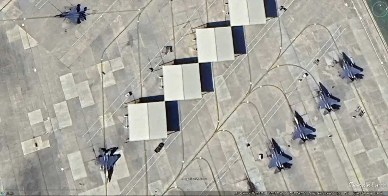 Спутниковый снимок Google Earth: укрытия рядом со стоянкой истребителей-бомбардировщиков F-15E на авиабазе Лейкенхит