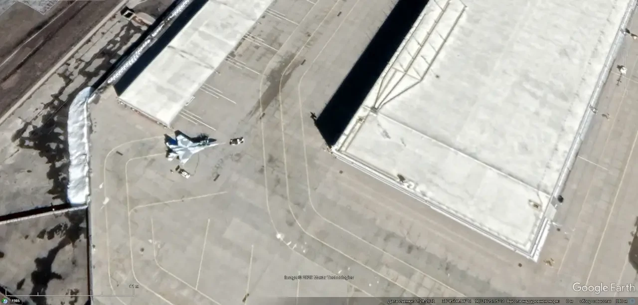 Спутниковый снимок Google Earth: истребитель F-15EX на заводском аэродроме Boeing в Сент-Луисе