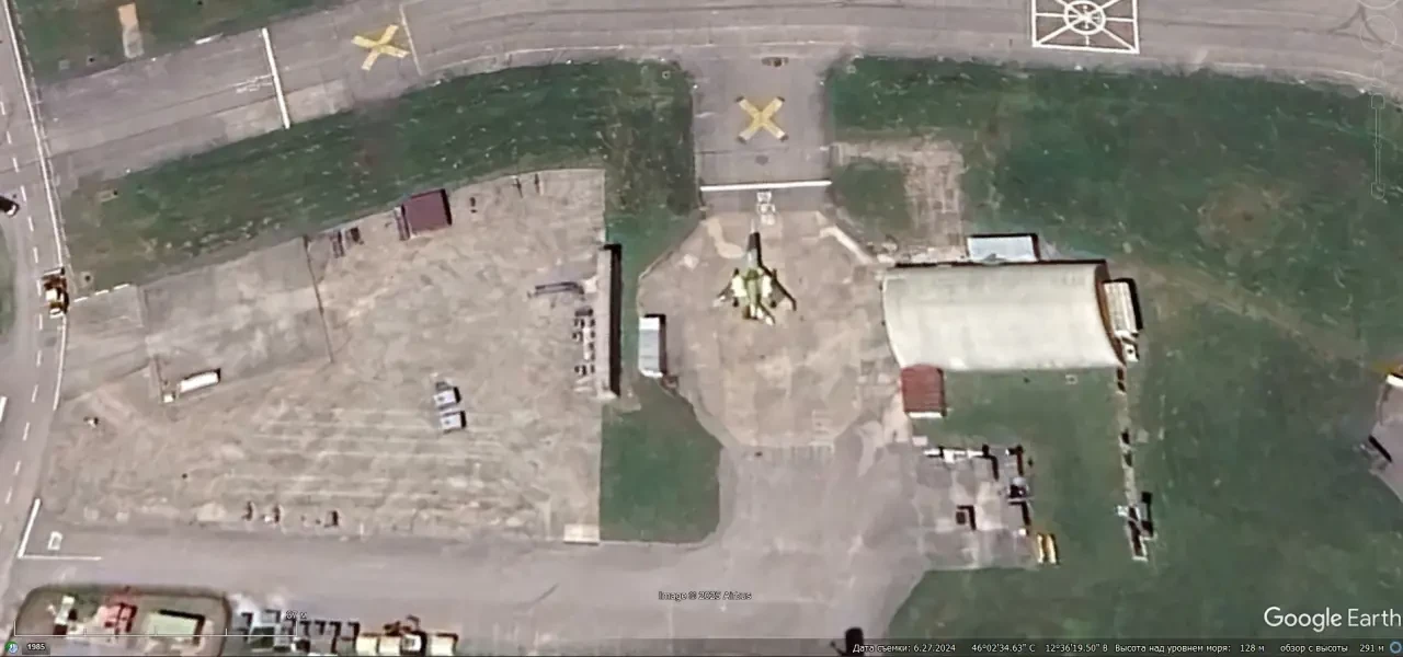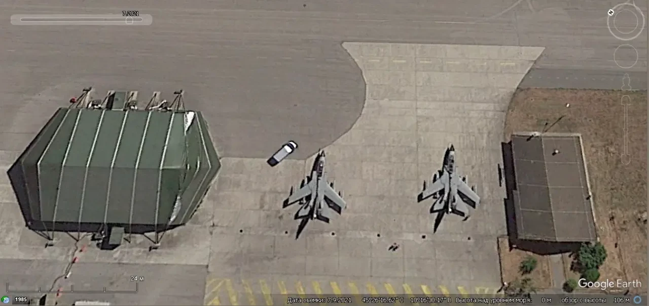 Спутниковый снимок Google Earth: истребитель-бомбардировщик Tornado IDS рядом с железобетонным укрытием на базе Авиано
