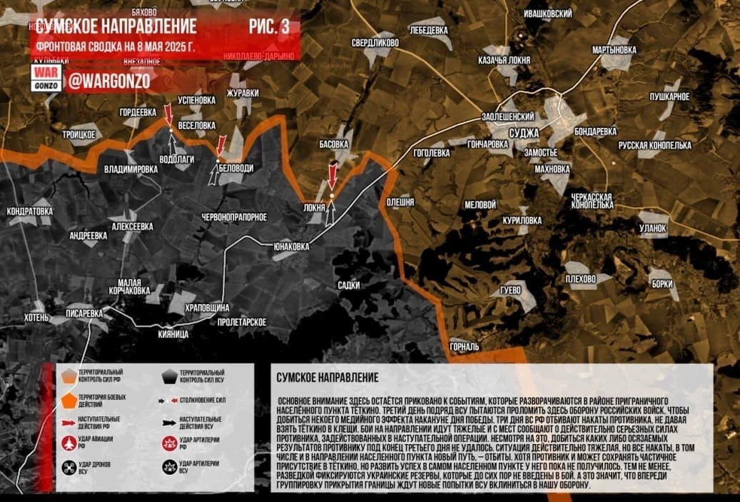 На Сумском направлении штурмовые группы ВС России продолжили расширять зону контроля, продвинулись в окрестностях сёл Водолаги, Беловоды и Локня, закрепляются.