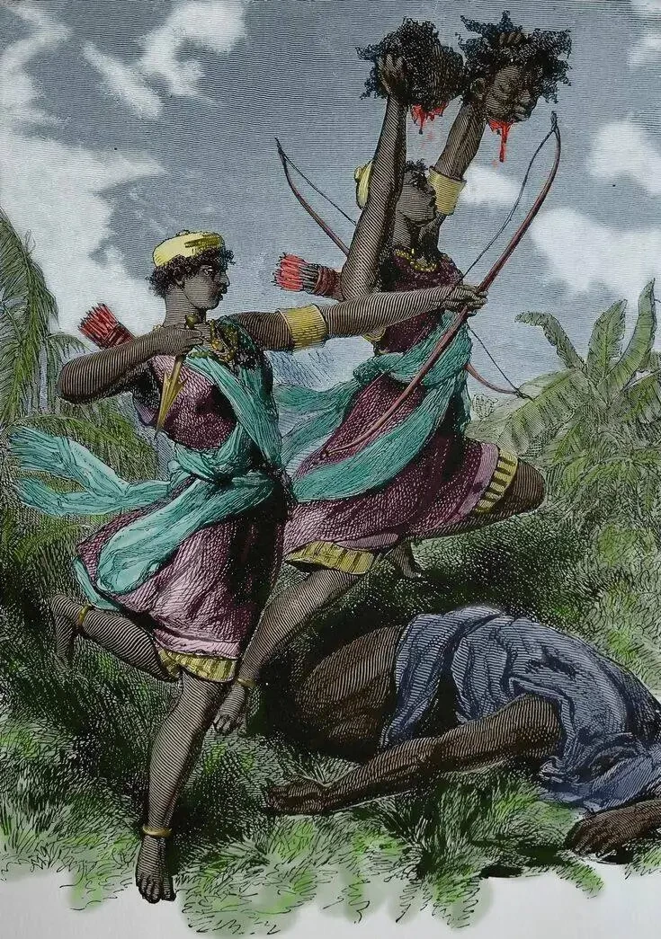 Впрочем, вся остальная история данного государства — примерно в том же духе. Нравы здесь были «весёлыми» до невозможности! В год в жертву приносили примерно 500 человек: рубили головы, душили, топили — фантазии хватало. В случае смерти короля на тот свет отправляли сразу 4–10 тысяч человек, чтобы не скучно было его величеству. Ритуальное людоедство, использование человеческого жира в качестве магической мази и прочее, и прочее, и прочее. Постепенно короли Дагомеи решили, что торговать через посредников невыгодно, и захватили выход к морю и порт Порто-Ново. Но самое интересное — армия данного государства, точнее, её элитная часть...