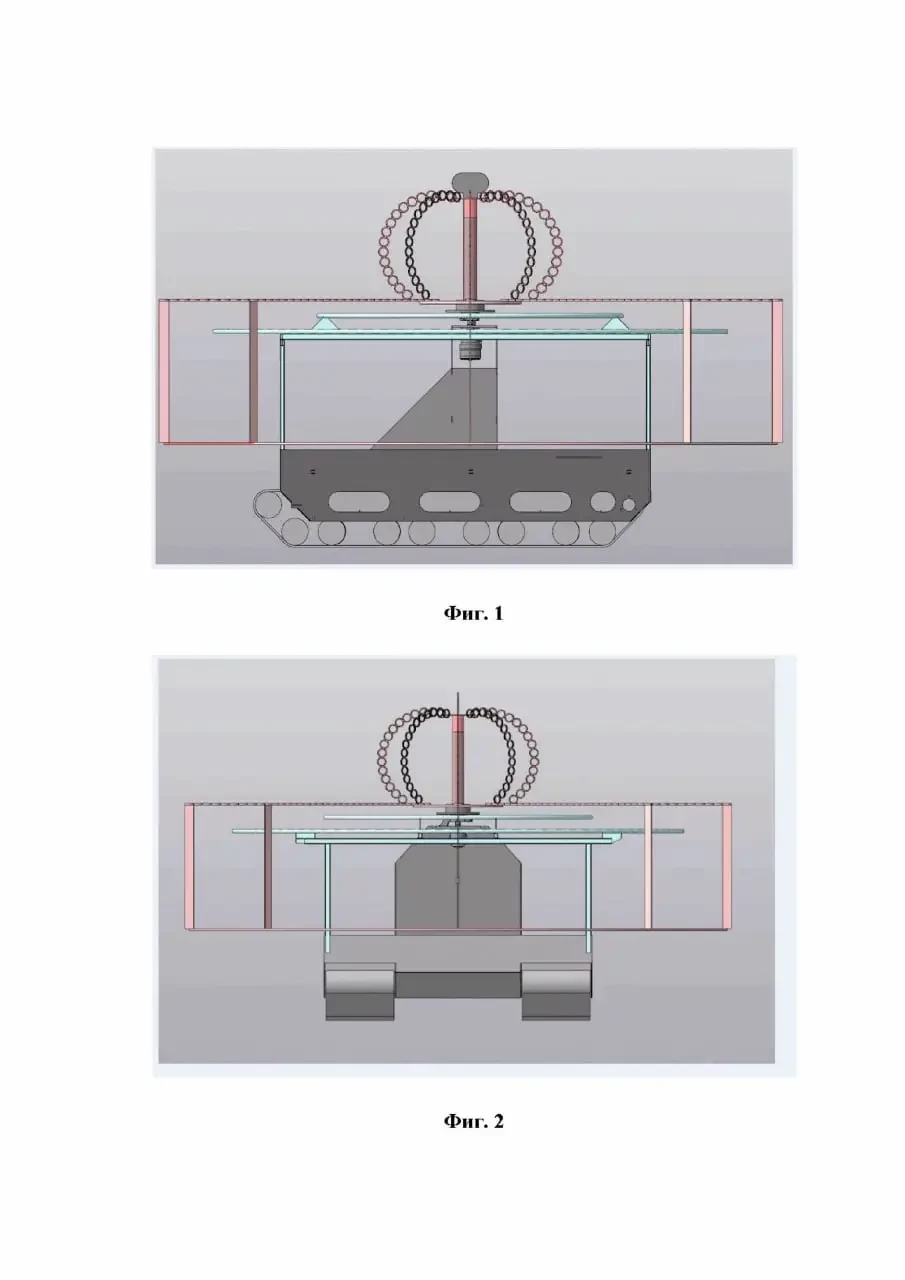 Нетривиальным вариантом защиты от FPV-дронов и сбросов можно считать различные вращающиеся элементы – цепи, лопасти, трубы и так далее. В одном из исполнений предлагается пространственная конструкция из труб с семью электромоторами и пропеллерами. Таким образом, автор пытается организовать круговую защиту от атакующих дронов. В качестве двигателя для пропеллеров, по всей видимости, можно использовать элементы БПЛА сельскохозяйственного назначения – в простонародье «Баба-Яга». Из описания патента: