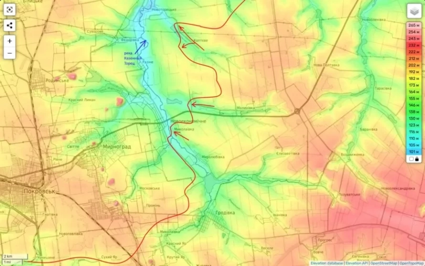 По данным Подоляки, российские войска продвинулись широким фронтом к реке Казённый Торец в районе Новоторецкого и Владимировки, обходя терриконы и ключевые высоты, которые могли бы стать опорными пунктами для ВСУ.