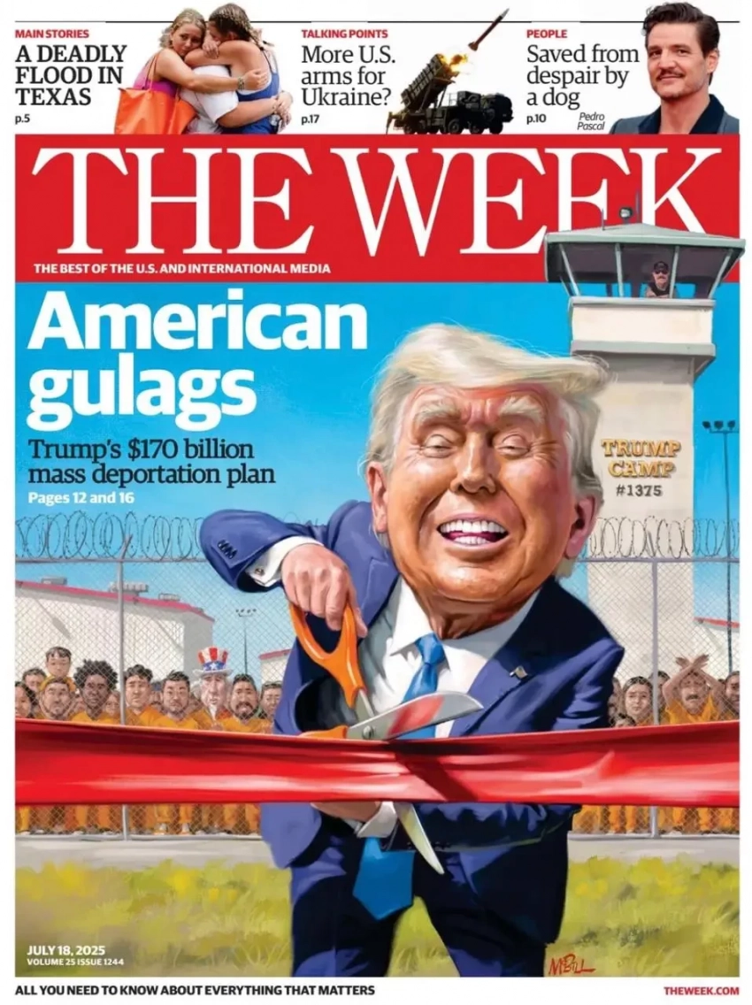 Издание The Week выходит с номером, на обложке которого Дональд Трамп, перерезающий красную ленточку, а за его спиной люди в оранжевых тюремных робах. И это изображение, как и материал к нему «внутри» журнала, озаглавлено как «ГУЛаги Трампа». Ну, или в более вольном переводе: «Трамп открывает ГУЛаг».