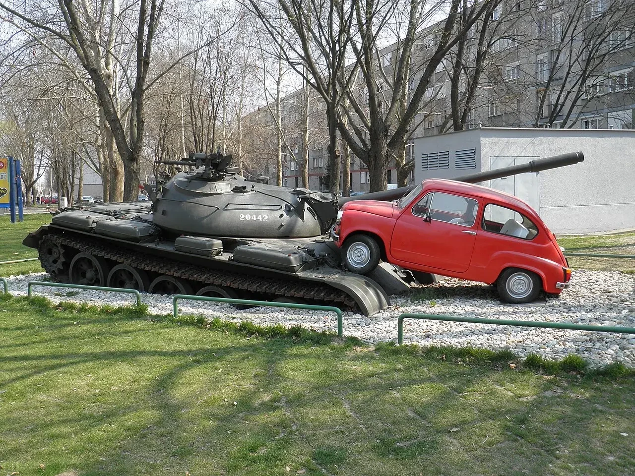 Один из таких — памятник с говорящим названием «Фича давит танк». Расположен он в Осиеке — городе в восточной части Хорватии. Инсталляция представляет собой настоящий танк, придавленный наехавшим на него легковым автомобилем «Застава-750» (фактически — итальянский Fiat 600) по прозвищу «Фича». И, стоит отметить, видок у этой конструкции более чем гротескный и даже комичный, что понятным образом вызывает живой интерес у туристов и не только.