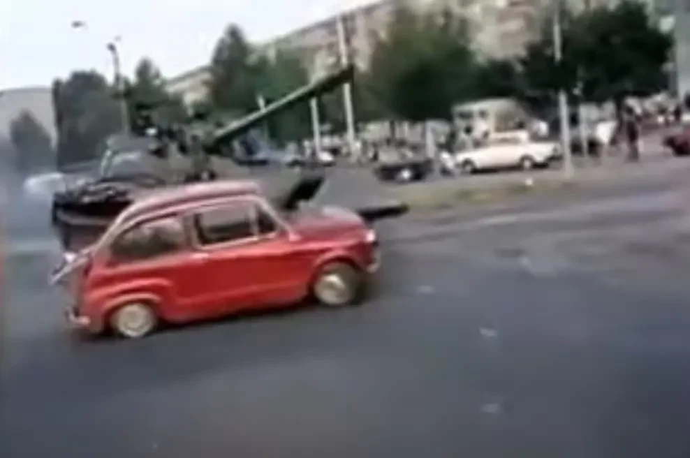 Танк задел малютку-«Фичу», потянул её волоком по асфальту несколько метров, пока стальная туша не поравнялась с проходящим рядом автобусом. Машину швырнуло в его бок, после чего гусеницы безжалостно смяли её, вдавив в дорожное полотно. Затем колонна пошла дальше своим маршрутом, а на перекрёстке осталась лишь плоская, как лепёшка, груда покорёженного металла — всё, что осталось от «упрямой «Фичи».