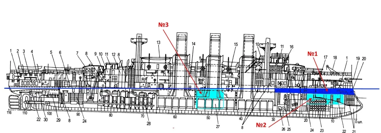 Итак, вода ниже жилой палубы определенно «просочилась», но вот сколько ее там было и как она распределилась по отсекам – можно только гадать. Известно лишь то, что она распространилась вплоть до помещений торпедных аппаратов и динамо-машин, но в остальном можно утверждать лишь то, что какое-то количество морской воды ушло в отсеки ниже жилой палубы в районе от 0 до 30 шпангоута.