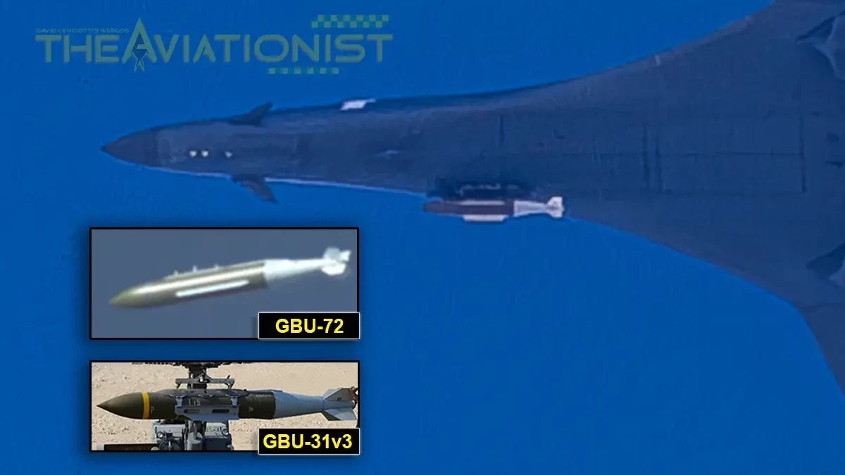 Крупный план авиабомбы, которая, по-видимому, является УАБ GBU-72/B, подвешенной на пилоне самолёта B-1B. На вставках показаны различия между авиабомбами GBU-72 и GBU-31v3