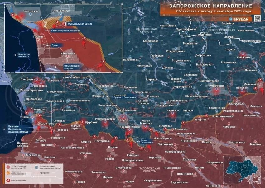 ▪️ На Запорожском участке позиционные бои в районе Приморского и Степногорска. Противник применяет дроны по нашим позициям в Каменском. В районе Новоданиловки и Малой Токмачки без изменений.