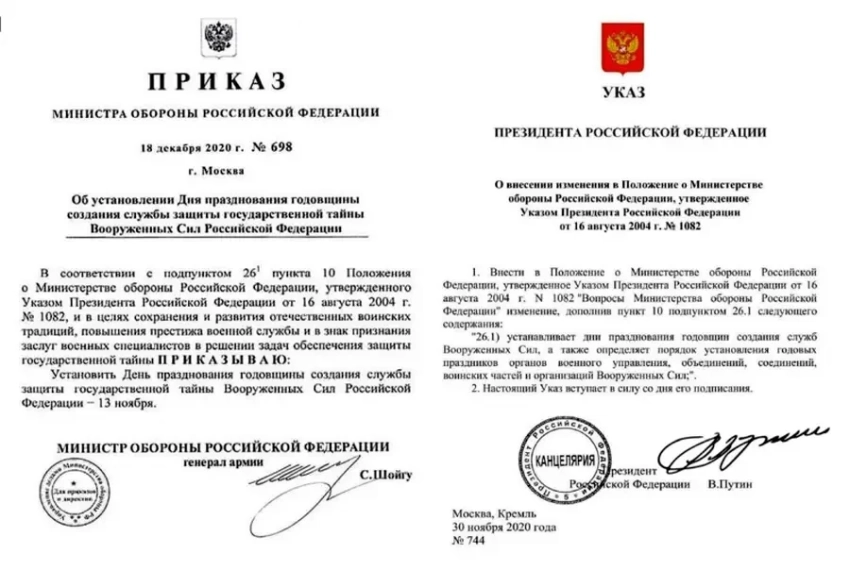 Сегодня, 13 ноября, в нашей стране отмечается День Службы защиты государственной тайны Вооруженных сил России (ЗГТ ВС РФ). В 1918 году в этот день вышел приказ Реввоенсовета Советской Республики, согласно которому учреждалось самостоятельное подразделение в структуре Главного штаба РККА, занимающееся вопросами шифрования и работой с секретными документами. В 1920 году штатные шифровальные органы были введены во все штабы военных округов, фронтов, армий и дивизий, а в 1921 году — во все штабы до бригады включительно.