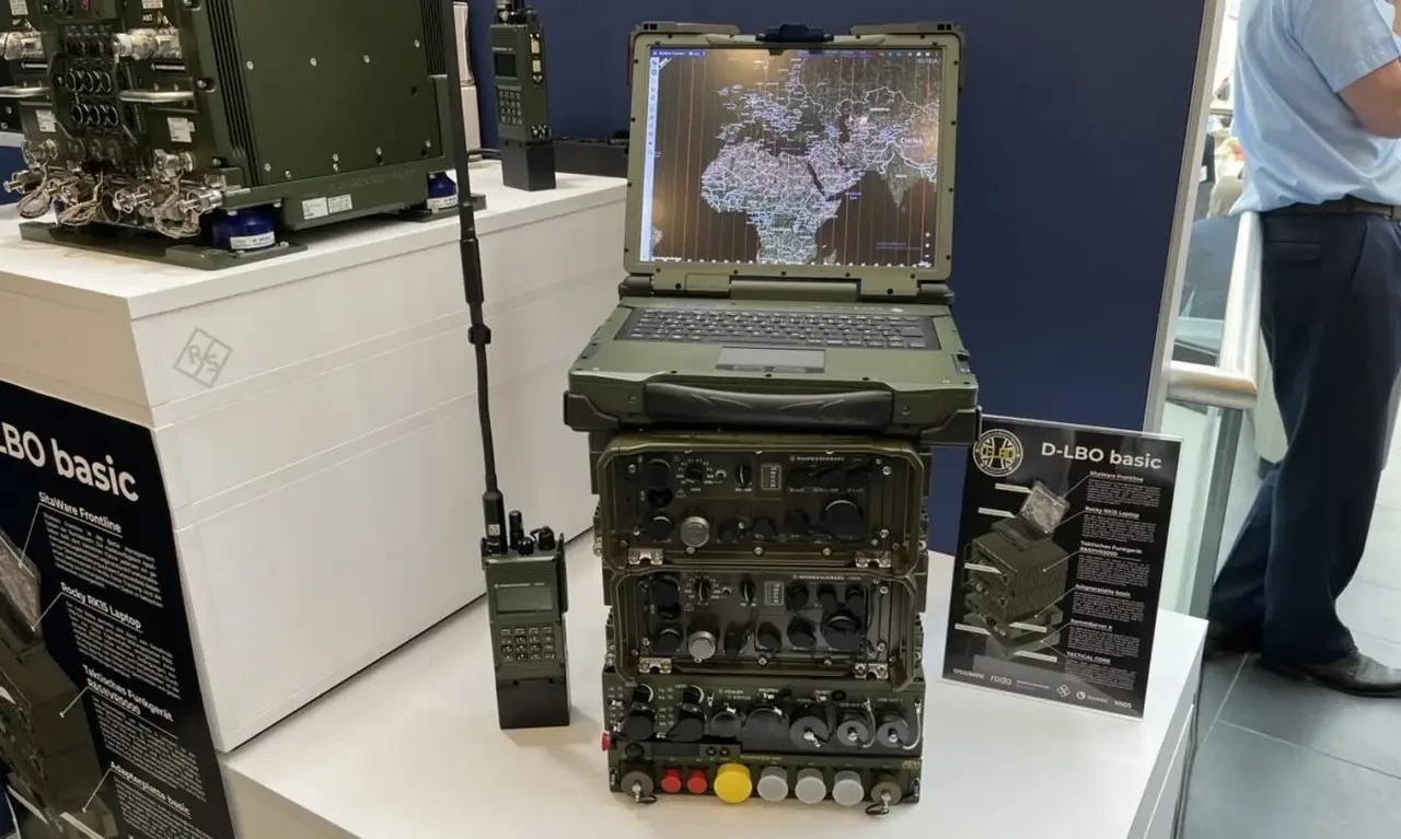 Компоненты базового комплекта D-LBO сверху вниз – ноутбук Rocky RK15, две тактические радиостанции VR5000, адаптер (на основе Grundplatt 80) и маршрутизатор KommServer X: