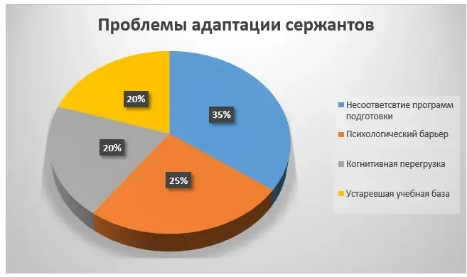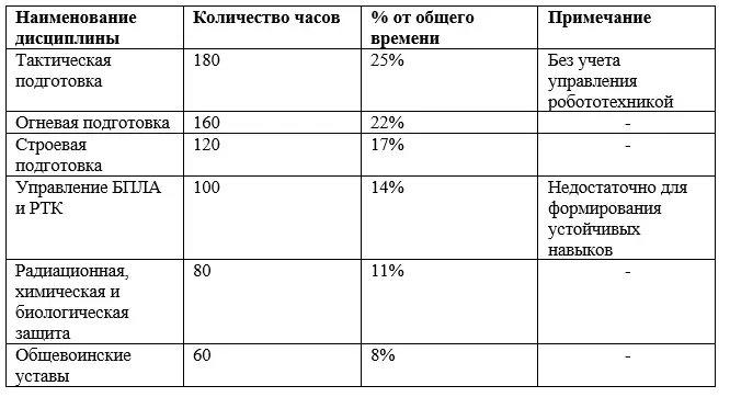 Действующие учебные планы сержантских училищ и курсов переподготовки сохраняют ориентацию на традиционную модель. Как показывает анализ учебных программ, более 70% времени отводится на строевую, физическую и огневую подготовку, в то время как на освоение комплексов сетевого управления и робототехники выделяется менее 15% учебного времени. Это создает ситуацию, когда выпускник, прибывая в войска, оказывается не готов к эксплуатации сложных технических систем, которые уже поставлены на вооружение.