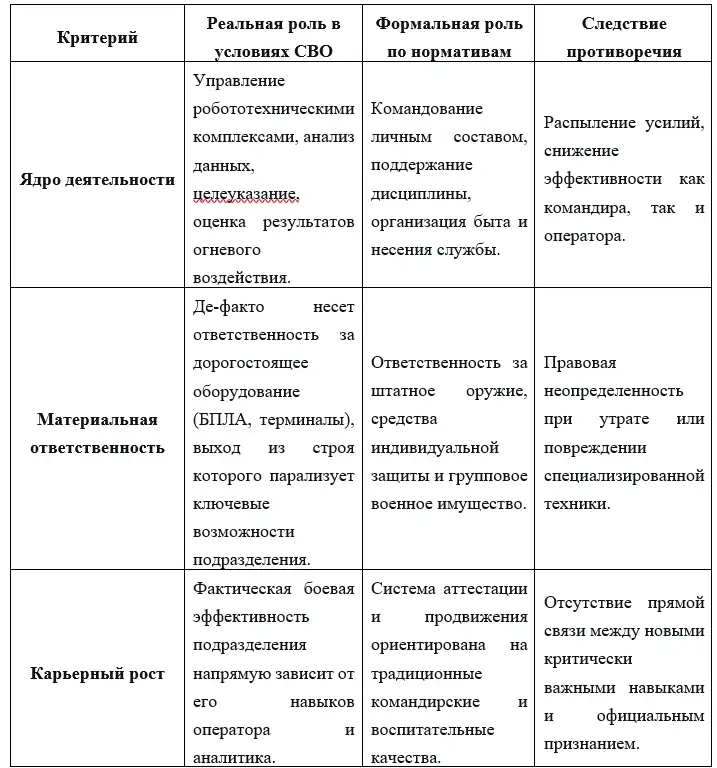 Однако данный переход наталкивается на системные проблемы, главными из которых являются: несоответствие действующих программ подготовки новым функциональным обязанностям, выраженный психологический барьер и кризис профессиональной идентичности среди части сержантского состава, а также когнитивная перегрузка в условиях насыщенной информационной среды. Особую остроту этим проблемам придает выявленный нормативный вакуум, при котором реальная, сформированная практикой боевых действий роль сержанта-оператора не закреплена в руководящих документах, что порождает правовую неопределенность и диссонанс между ответственностью и полномочиями.