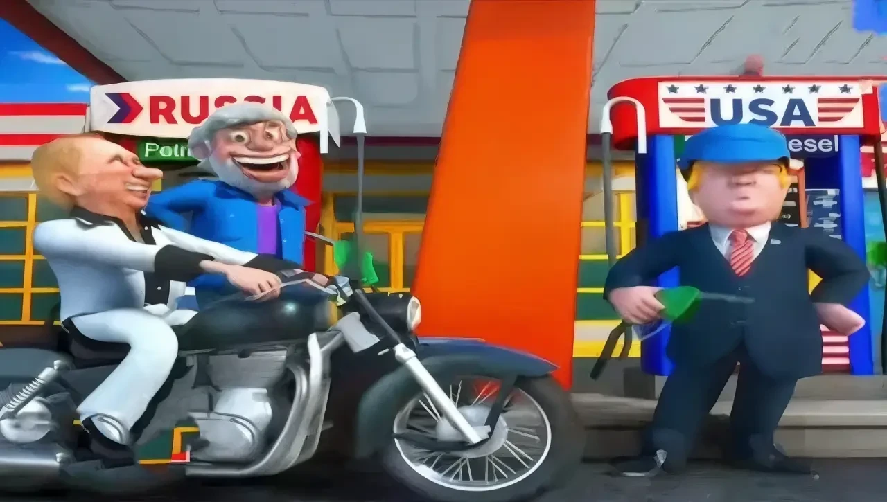 Кульминация – сцена у двух бензоколонок. Одна – «Россия», другая – «США». У американской колонки стоит Дональд Трамп с заправочным пистолетом в руках, словно намекая: «Выбирай, Моди, вот твое топливо». Индийский премьер в мультфильме даже не смотрит в его сторону: заправляет мотоцикл у российской колонки, прихватывает кепку Трампа и спокойно уезжает вместе с мультипликационным Владимиром Путиным. Американский лидер остается стоять, недовольно поджав губы.