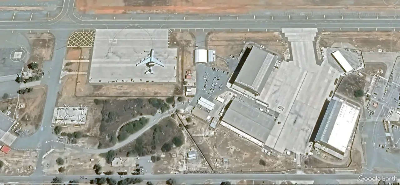 Спутниковый снимок Google Earth: самолёт ДРЛО Boeing E-3G Sentry и другая авиационная техника на территории авиаремонтного предприятия, расположенного на авиабазе Тинкер