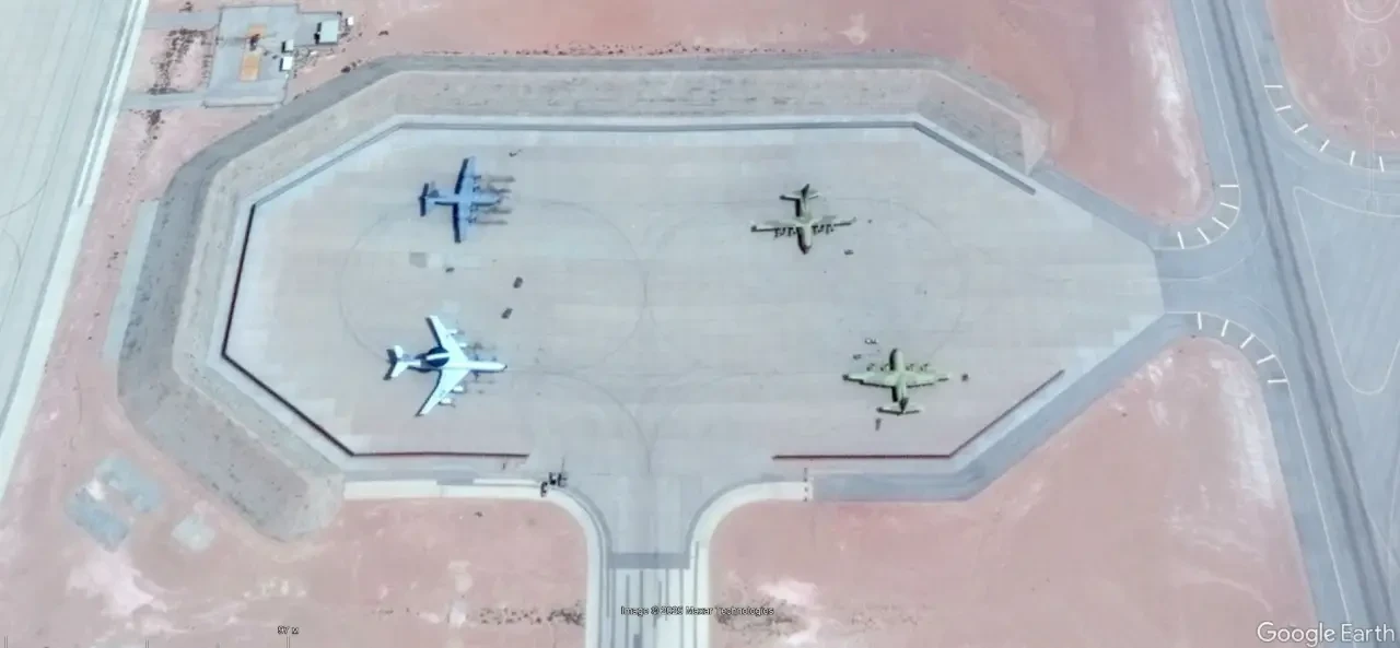 Спутниковый снимок Google Earth: самолёты ДРЛО Boeing E-3G Sentry и военно-транспортные Lockheed C-130Н Hercules на авиабазе Принц Султан
