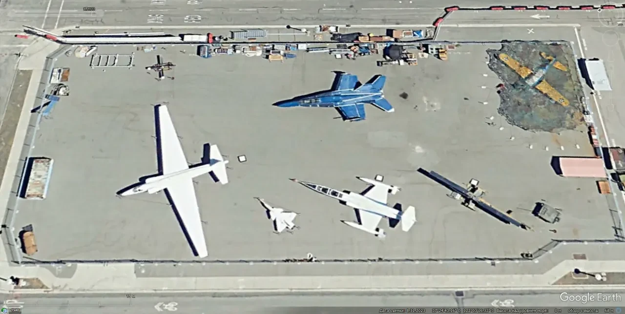 Спутниковый снимок Google Earth: нетипично окрашенный в белый цвет самолёт U-2, летавший в интересах НАСА, среди авиатехники, выведенной из эксплуатации, на стоянке аэродрома Моффетт