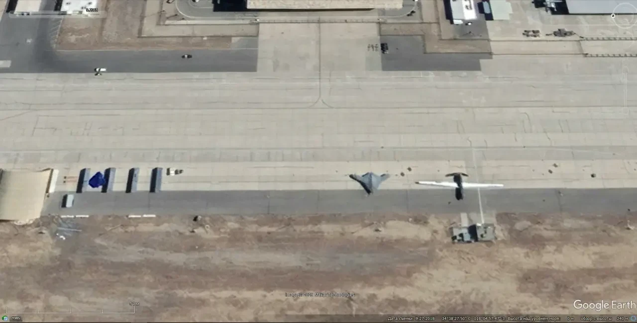 Спутниковый снимок Google Earth: БПЛА Lockheed Martin RQ-170 Sentinel и бомбардировщик Northrop Grumman B-2A Spirit на предприятии Lockheed Martin в Палмдейле