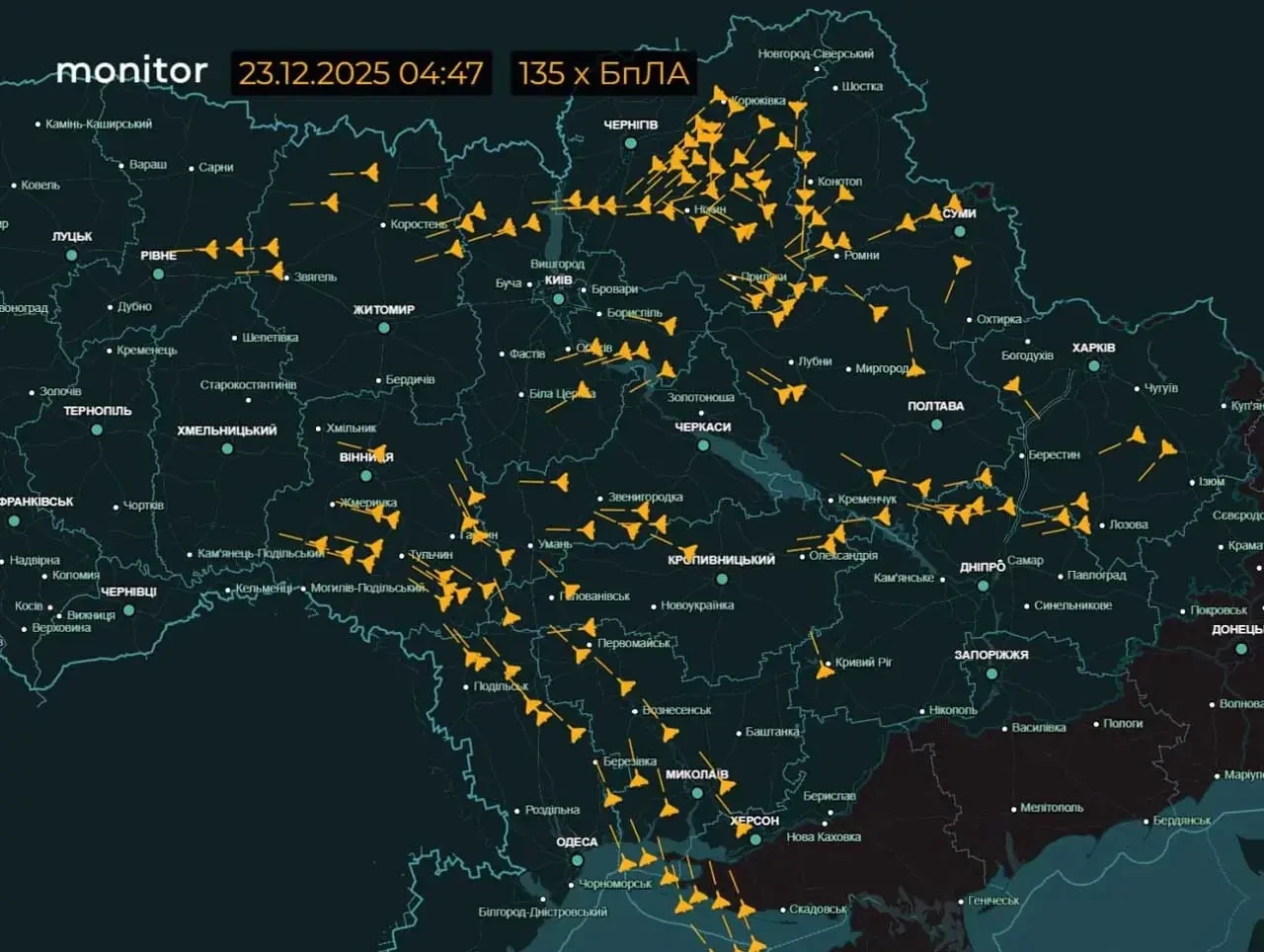Если верить этим картам, то наибольшее число «Гераней» фиксируется над севером Украины – с полётом через Черниговскую область.