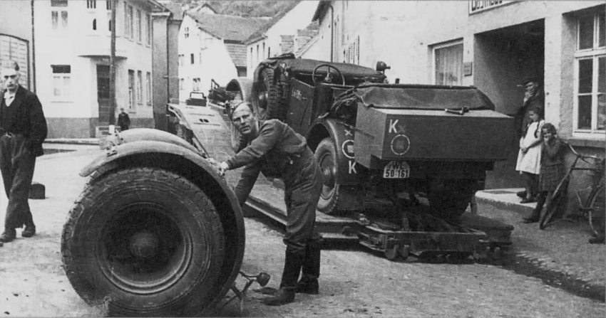 На фотографиях запечатлён эпизод работы немецкого эвакуатора. Легковой автомобиль офицера Люфтваффе вышел из строя и теперь эвакуируется с помощью одного из тяжёлых низкорамных прицепов вермахта – Sd.Ah. 115 в 10-тонном варианте. Sd.Ah. 115 (Sonderanhänger 115 – специальный прицеп 115) – это тяжёлый низкорамный трал, разработанный фирмой Goldhofer и производившийся с 1937 года. 10-тонная версия предназначалась для перевозки лёгкой и средней бронетехники, повреждённых автомобилей и тяжёлых грузов. Прицеп имел низкую погрузочную платформу, аппарели для заезда и мог буксироваться мощными полугусеничными тягачами (например, Sd.Kfz. 7 или Sd.Kfz. 9)