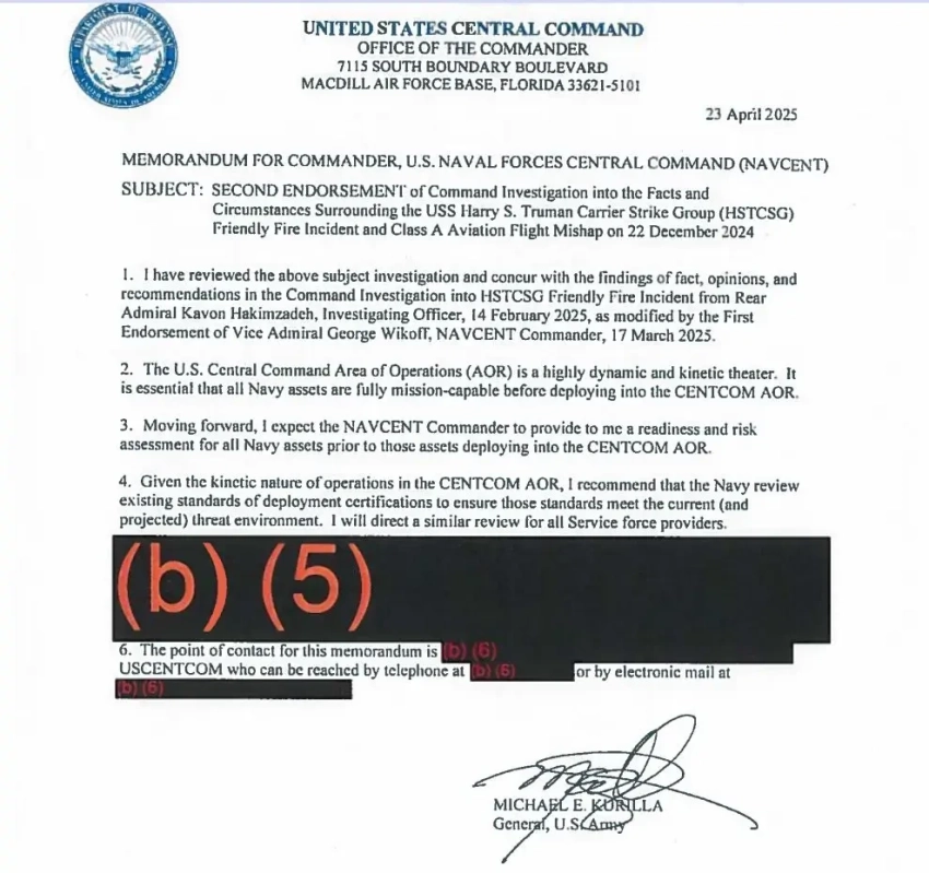 Согласно документу, 21 декабря 2024 года в период 23:25–23:26 Z (Z означает время по Гринвичу) крейсер USS GETTYSBURG ракетой SM-2 сбил один истребитель F/A-18F (в дальнейшем Aircraft 107), а второй такой же самолет (Aircraft 112) отделался тем, что у них называется «near miss» (можно перевести как «чуть было не было»). Самолеты были ошибочно приняты за вражеские ПКР. Кроме того, крейсер уже было прицелился в третий самолет (Aircraft 211), но успел отменить пуск.