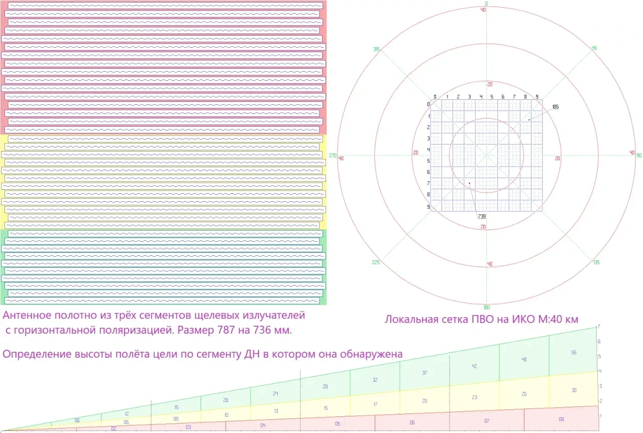 Предполагаю, что найдётся продвинутый читатель, который с ходу забракует предлагаемый концепт МРК, потому что РЛС двухкоординатная, это из той категории людей, которым важнее шашечки, а не ехать. Упомянутый несложный компьютер при необходимости может выдавать ориентировочную высоту обнаруженных ВЦ, исходя из достоверных данных, в каком сегменте была зафиксирована цель и на какой дальности. Исходя из того, что коптеры вертолётного типа обладают высокими маневренными характеристиками в плане изменения высоты полёта, а более стабильные по высоте полёта летательные аппараты самолётного типа не склонны к резким изменениям высоты, исходя из нарезанных задач, то для разведывательной РЛС дежурного режима ошибка определения высоты ВЦ в 2–3 гектометра не должна считаться критическим недостатком.