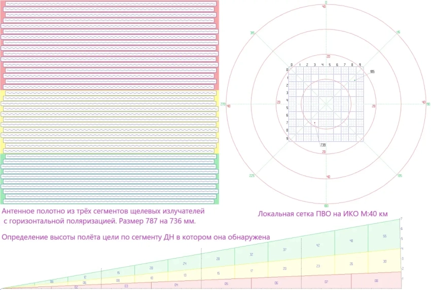 Верхний сегмент, отвечающий за обзор воздушного пространства непосредственно у поверхности земли, состоит из 16 волноводов со щелевыми излучателями в количестве 50 и 51 единиц. Верхний сегмент, как целостная антенна, будет обладать габаритными размерами 783 на 317 миллиметров (при интервале между волноводами 3 мм), что при площади антенны 0,248 м2 обеспечит коэффициент усиления 13840 с шириной диаграммы направленности 1 градус по горизонтали и 2,39 градуса по вертикали. Превосходные показатели не только для разведывательной РЛС, но и для РЛС боевого режима!
