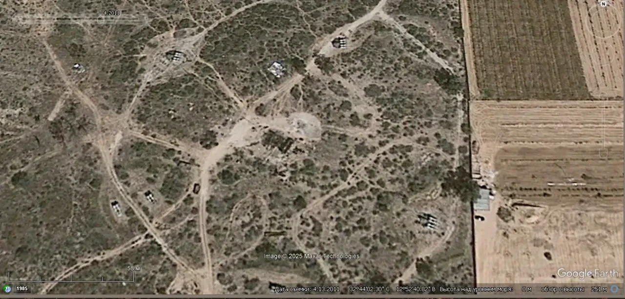 Спутниковый снимок Googlе Eаrth: позиция ЗРК С-125 в 12 км северо-западней Каира. Видно, что на позиции осталось две пусковых установки без ракет. Снимок сделан в апреле 2025 года