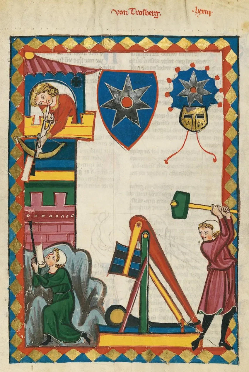 Осада средневекового замка. Книжная миниатюра из «Манесского кодекса» (ок. 1300 г.), посвященная поэту фон Тростбергу. Слева показана любовная переписка при помощи посланий, привязанных к стрелам арбалета. Справа – примитивный требюше, у которого тяжелым молотом выбивают пусковую чеку. Библиотека Гейдельбергского университета