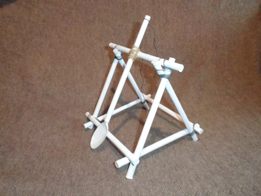 Сначала мы скатываем на карандаше «бревна» из бумаги, которые должны быть ровными и плотными, и хорошенько промазываем их клеем ПВА. Торцы их заклеиваем квадратиками из бумаги, а когда клей высохнет – обрезаем по краю излишек бумаги ножницами. Три бревна укладываем друг на друга так, чтобы получился треугольник, концы которого расходятся в форме латинской буквы V – как на нашем фото. Треугольников таких у вас должно быть два. А когда они у вас будут, вам нужно будет соединить их тремя другими «бревнышками», опять-таки так, как вы видите на нашей фотографии, причем соединение будет прочнее, если использовать клей. Для большей прочности соединения бревен рамы можно обмотать суровыми нитками (как будто бы это веревки!) и опять же промазать их клеем. Последнее «бревно» мы используем для изготовления рычага. Вставляем в его торец ручку ложки до упора, и… все!