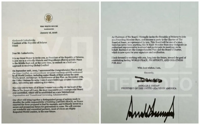 Официальный Минск получил подписанное Дональдом Трампом письмо, в котором он лично пригласил Лукашенко присоединиться к создаваемому президентом США так называемому «Совету мира». Как подчеркнули в белорусском МИДе, Трамп предложил Белоруссии стать одним из основателей новой международной организации.
