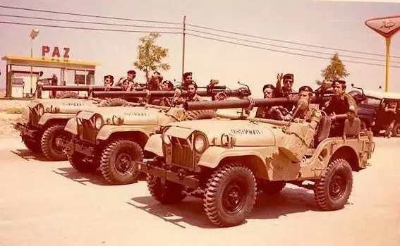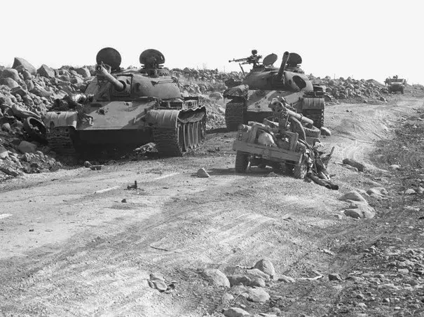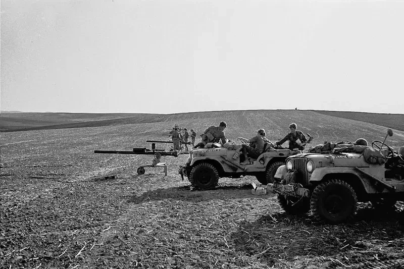 Разбитый израильский джип с 106-мм безоткатным орудием М40А1 рядом с брошенными арабскими танками