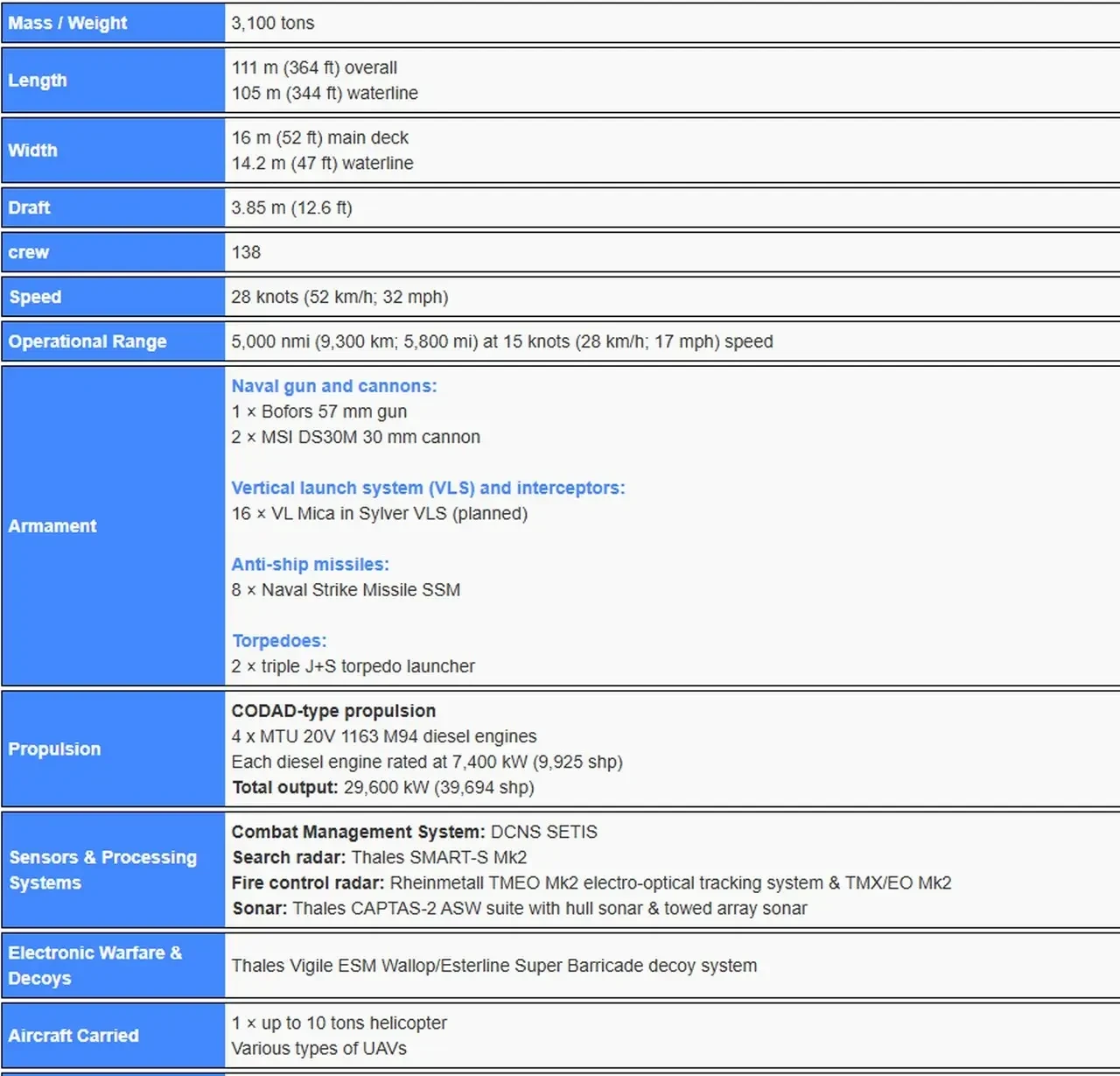 ТТХ проекта Maharaja Lela (также известного как Gowind 3100):