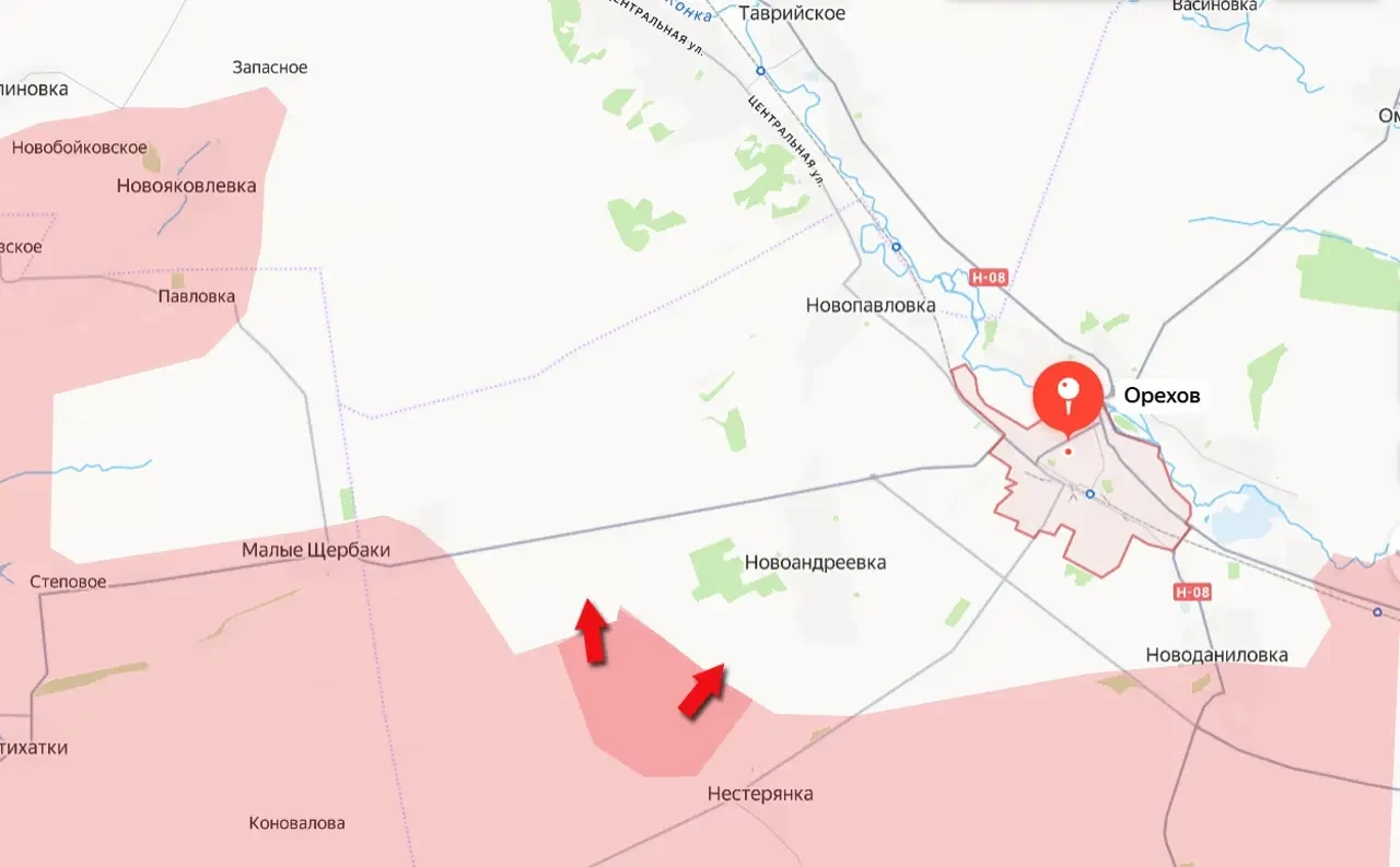 Напомним, что северо-западнее Орехова российские штурмовые группы подошли к населённому пункту Запасное, что в 8 км от автомобильной дороги Орехов-Запорожье. Такое расстояние позволяет создать значительные проблемы для противника, использующего эту дорогу (Н-08) для снабжения Ореховского гарнизона.