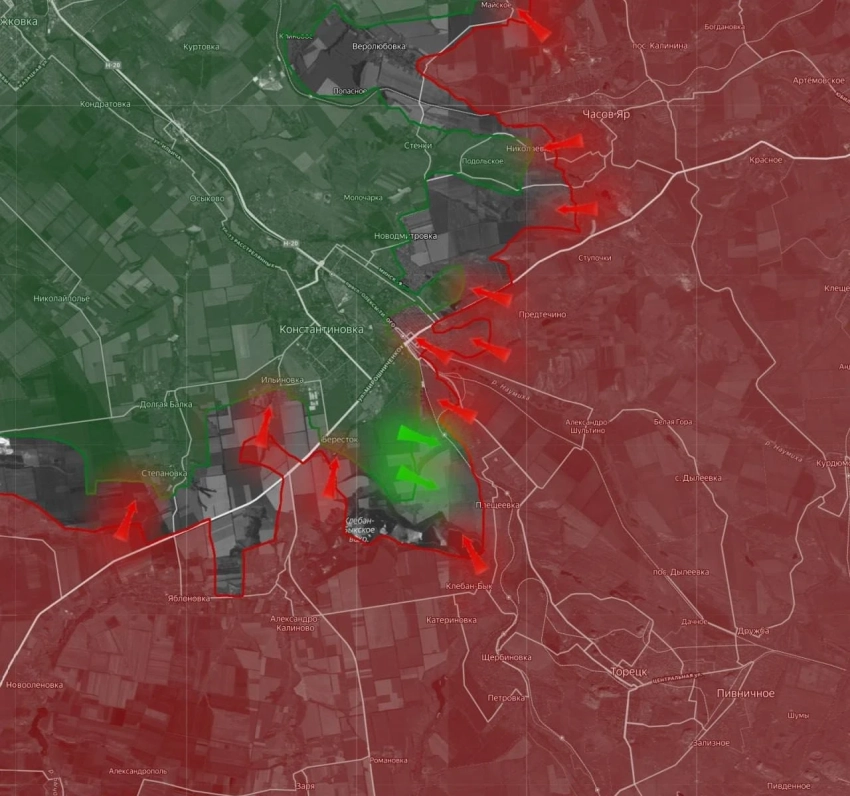 На Константиновском фронте ВС РФ зачищают подвалы на северо-восточной окраине занятого вчера Берестка, от которого до южного предполья Константиновки остаётся 1 км. Наши накапливаются в районе соседней Ильиновки, чтобы продолжать штурм села. В Константиновке под контролем российских войск ж/д вокзал и его территория. На северном фланге без существенных изменений: идут бои на рубеже Марково - Майское.