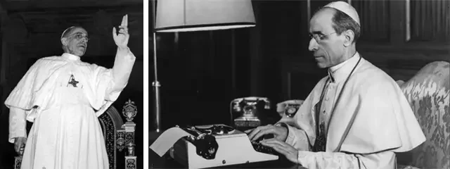 На фото слева: католические партизаны держатели плакатов с изображением Папы Пия XII во время освобождения Рима 4 июня 1944 года. На фото справа: Папа Пий XII встречается с детьми, пострадавшими во время войны