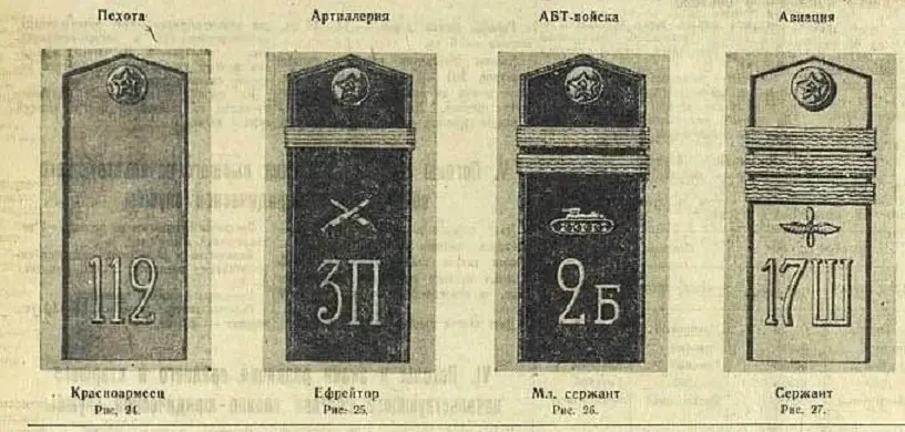 2. Установить звания для рядового и младшего начальствующего состава: в сухопутных и воздушных силах — а) красноармеец, б) отделенный командир, в) младший комвзвод, г) старшина…