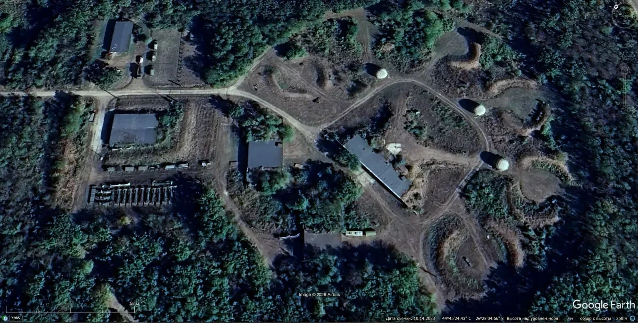 Спутниковый снимок Google Earth: позиция румынского ЗРК С-75М3 к югу от Бухареста. Зенитных ракет на пусковых установках нет. Снимок сделан в марте 2025 года