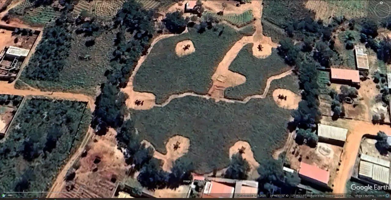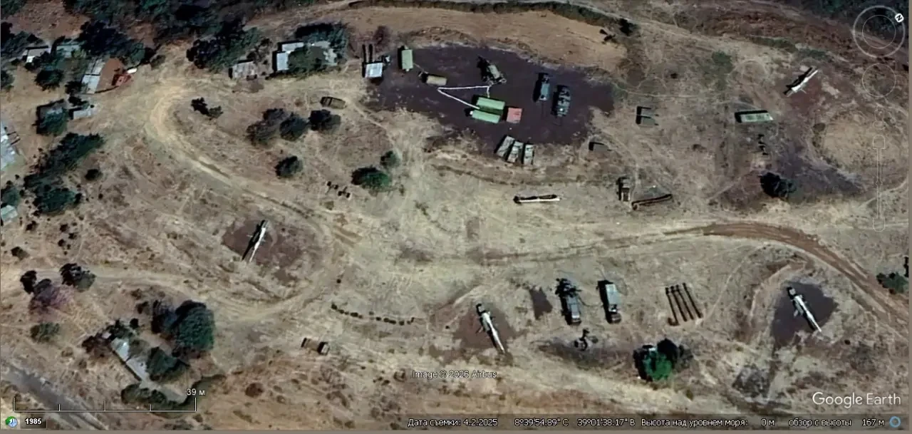 Спутниковый снимок Google Earth: полевая позиция эфиопского ЗРК С-75 южней авиабазы Дэбрэ-Зэйт. Снимок сделан в апреле 2025 года