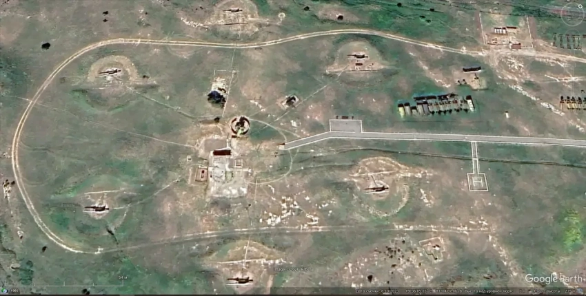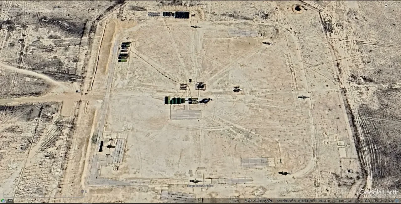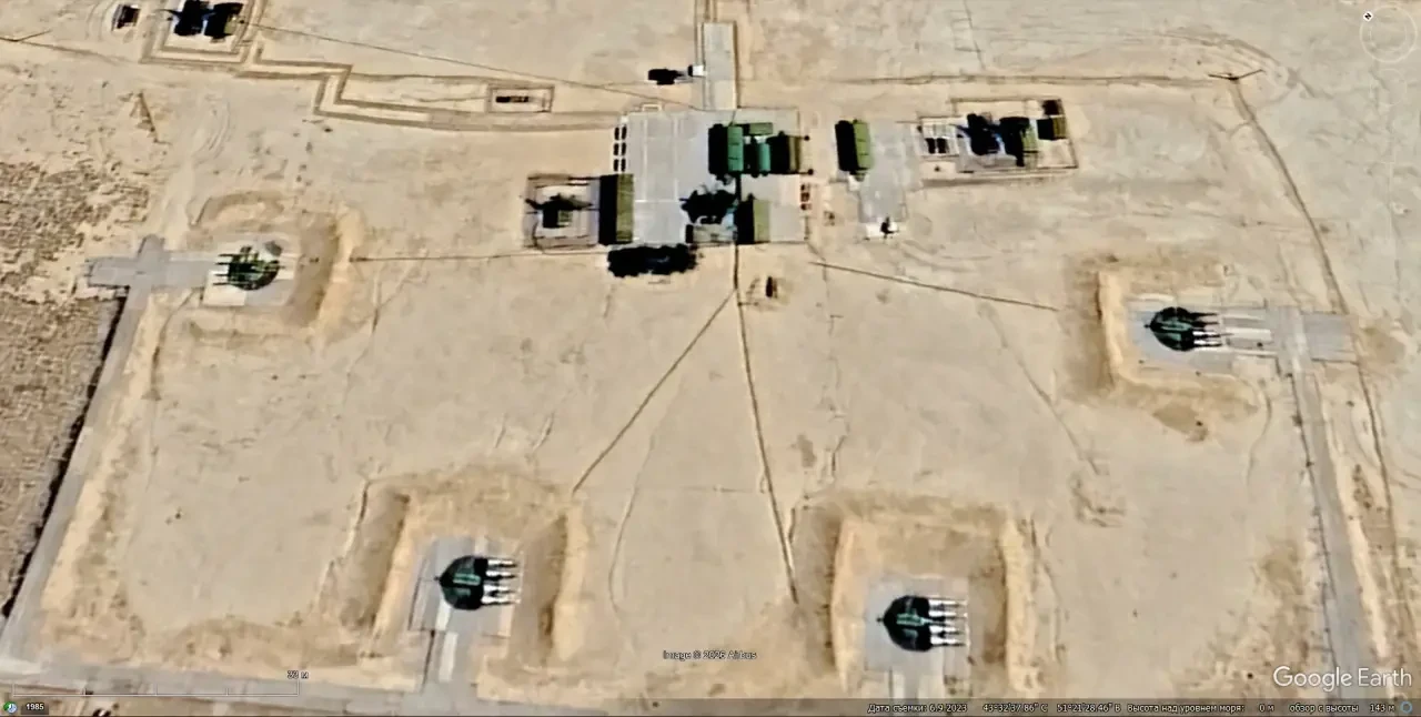 Спутниковый снимок Google Earth: ЗРК С-75М3 развёрнутый на бывшей позиции С-200ВМ в 10 км юго-восточней Актау. Снимок сделан в июне 2023 года