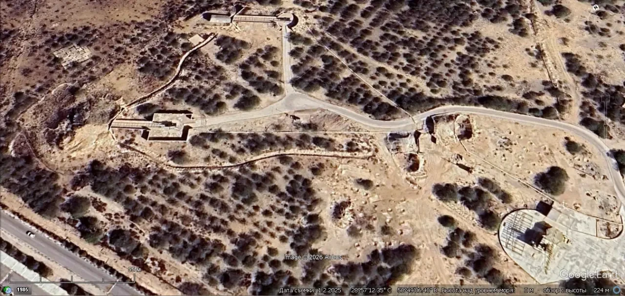 Спутниковый снимок Google Earth: позиция ЗРК С-125, расположенная рядом с Мемориалом обороны Суэцкого канала. Слева от позиции ЗРК расположена зенитная артиллерийская батарея. Снимок сделан в июне 2025 года