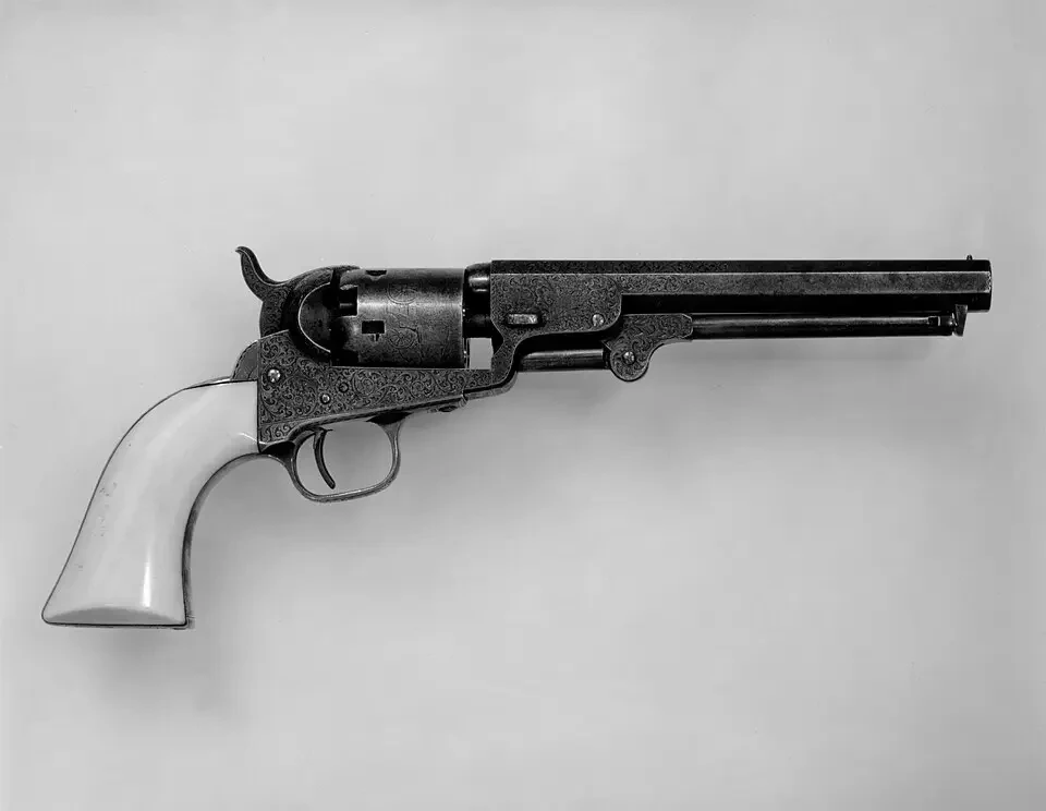 14. «Кольт-Патерсон» частый гость в статьях про револьверы Сэмюэля Кольта, но вот фото такого «Патерсона» встречаются редко. Это «Патерсон» № 3. Выпуск 1838 г. Производство в Патерсоне, Нью-Джерси. Материалы: сталь, серебро, перламутр. Длина 42,55 см. Длина ствола 30,48 см. Калибр 10,2 мм