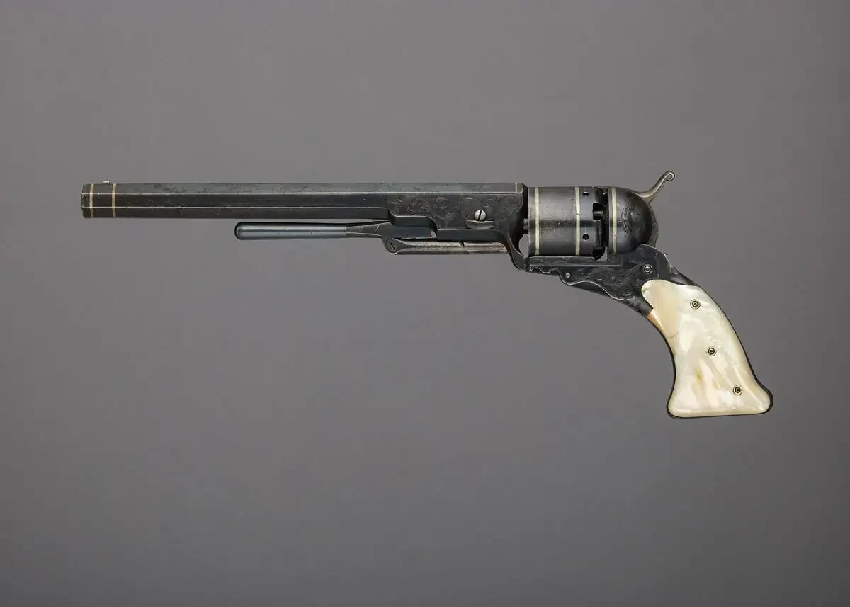 15. «Кольт-Патерсон», но уже с добавленным под ствол рычагом для тугой забивки пули. Материалы: сталь, серебро, перламутр. Ок. 1840 г. Длина 35,56 см, длина ствола 22,86 см. Калибр 10 мм