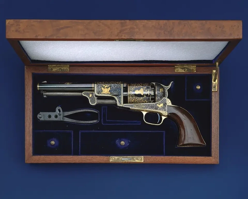 21. Еще один подарочный кольтовский револьвер той же третьей модели в красивом футляре вместе с принадлежностями. Подобные револьверы были изготовлены в специальной мастерской Кольта и затем подарены императору Николаю I с целью завоевать его расположение и добиться выгодных поставок своего оружия для российской императорской армии. Год выпуска: 1848. Материалы: сталь, золото, дерево. Длина 24,8 см, длина ствола 12,7 см. Калибр 7,9 см. Вес 671,9 г